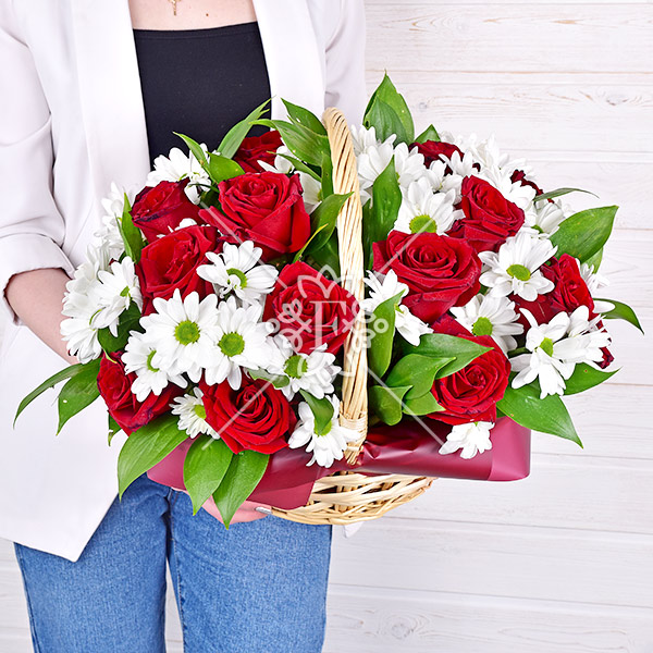 Романтика чувств – корзина с красными розами и белыми хризантемами